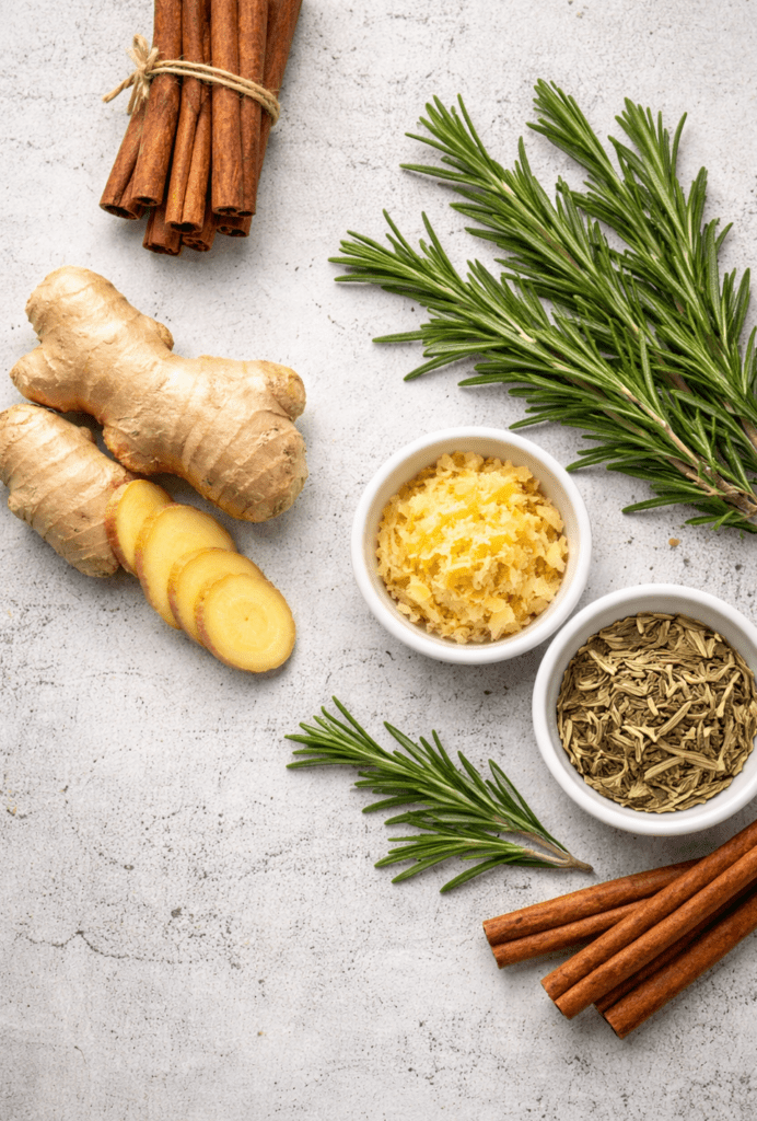 - Add cinnamon sticks, rosemary, and slices of fresh ginger
